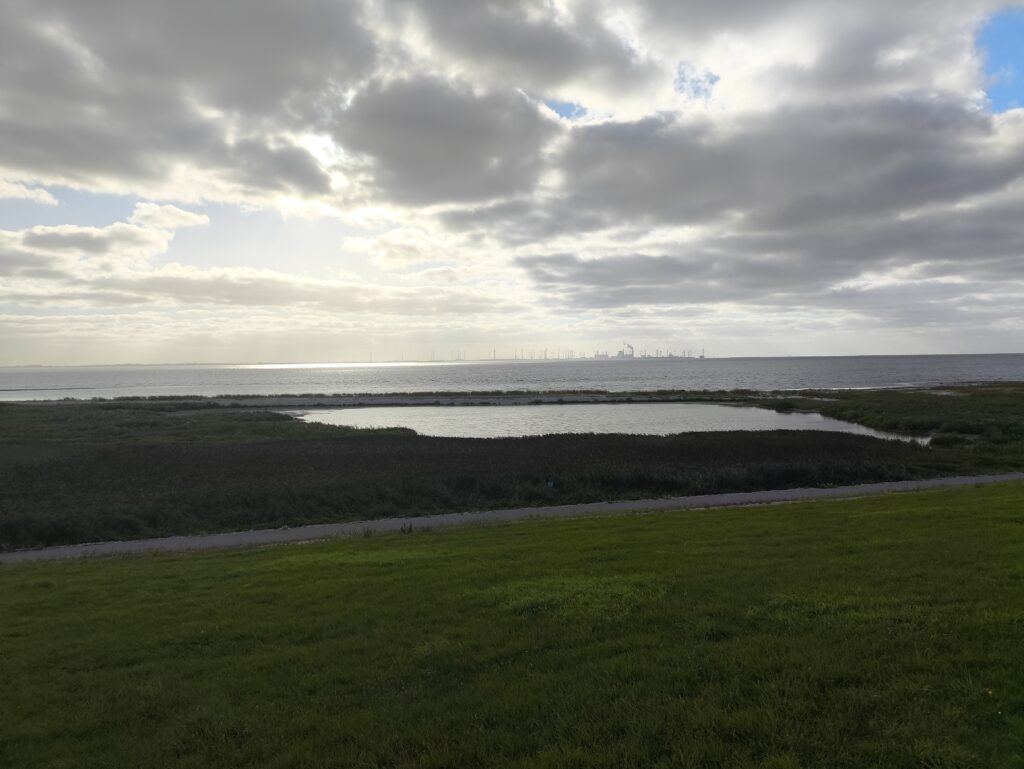 Zum Ausklang des Tages gab es noch einen Spaziergang über den Deich mit Blick auf Eemshaven (NL), wo die Schornsteine der RWE Eemshavencentrale rauchen